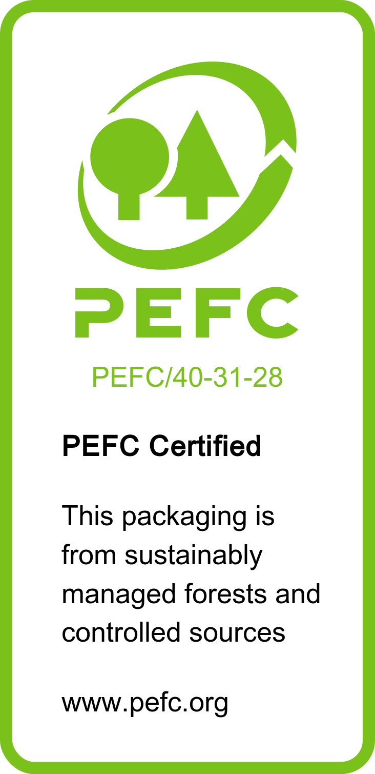 PEFC Certification means that the board used for our packaging comes from a sustainable source and there is a chain of custody tracking the board from the forest right down to the end product.